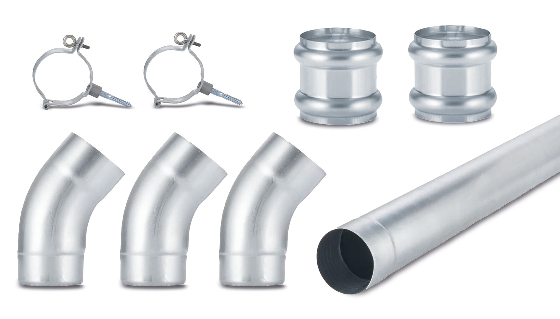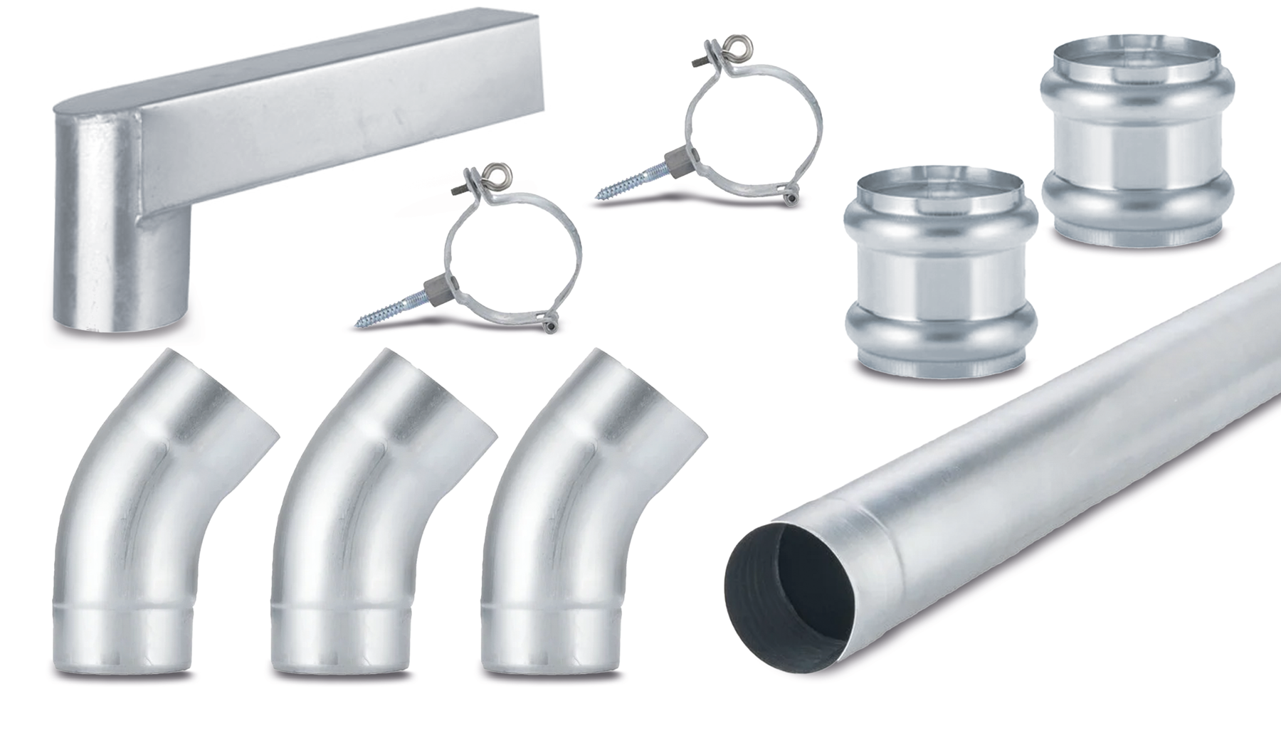 Zinken afvoerset voor platdak, inclusief onderuitloop. De set is geschikt voor het afvoeren van regenwater van platte daken bij buitenverblijven, overkappingen en andere houtconstructies.