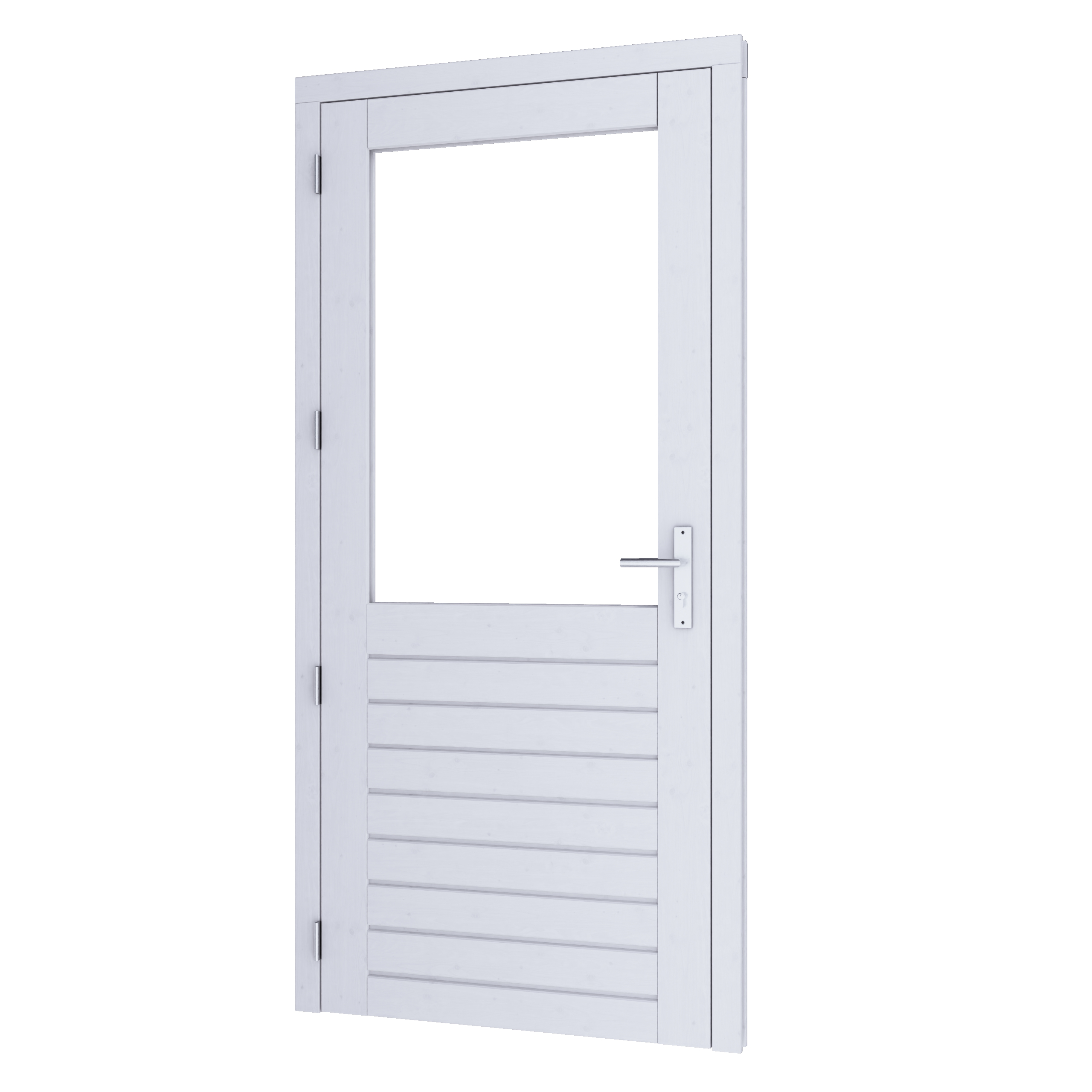 Douglas Stapeldorpeldeur enkel DELUXE (linksdraaiend) 930×2111 mm met kozijn 1064×2191 mm, wit gegrond, inclusief SKG-slot en dubbelglas.