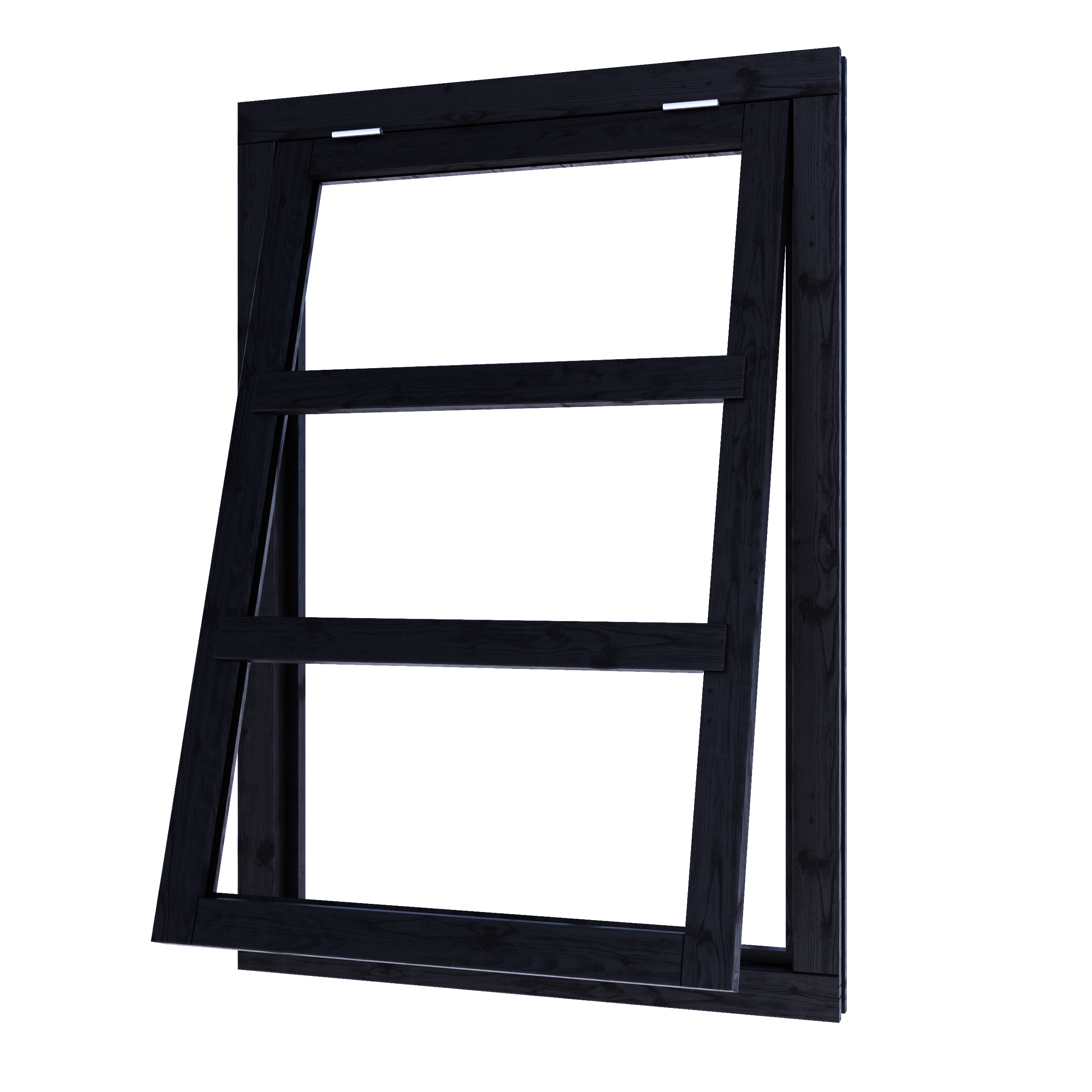 Douglas uitzetraam enkel 768×1168 mm met kozijn 902×1302 mm. Zwart gegrond Douglas hout, inclusief uitzetmechanisme.