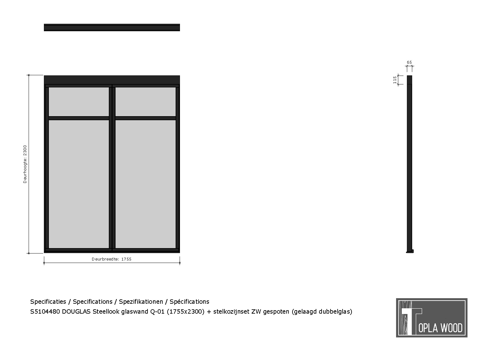 DOUGLAS Steellook glaswand Q-01 (1755x2300) + stelkozijnset ZW gespoten (gelaagd dubbelglas)