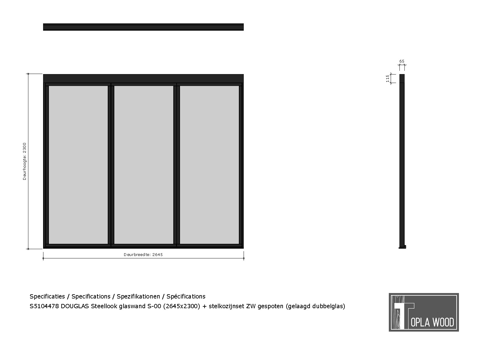 DOUGLAS Steellook glaswand S-00 (2645x2300) + stelkozijnset ZW gespoten (gelaagd dubbelglas)