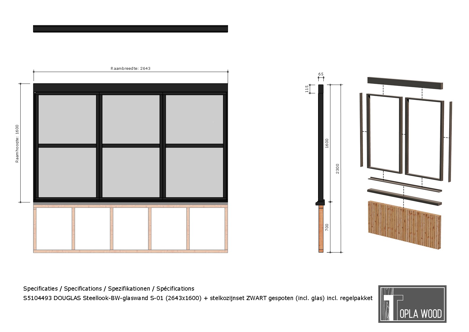 DOUGLAS Steellook-BW-glaswand S-01 (2645x1600) + stelkozijnset ZWART gespoten (incl. dubbelglas)
