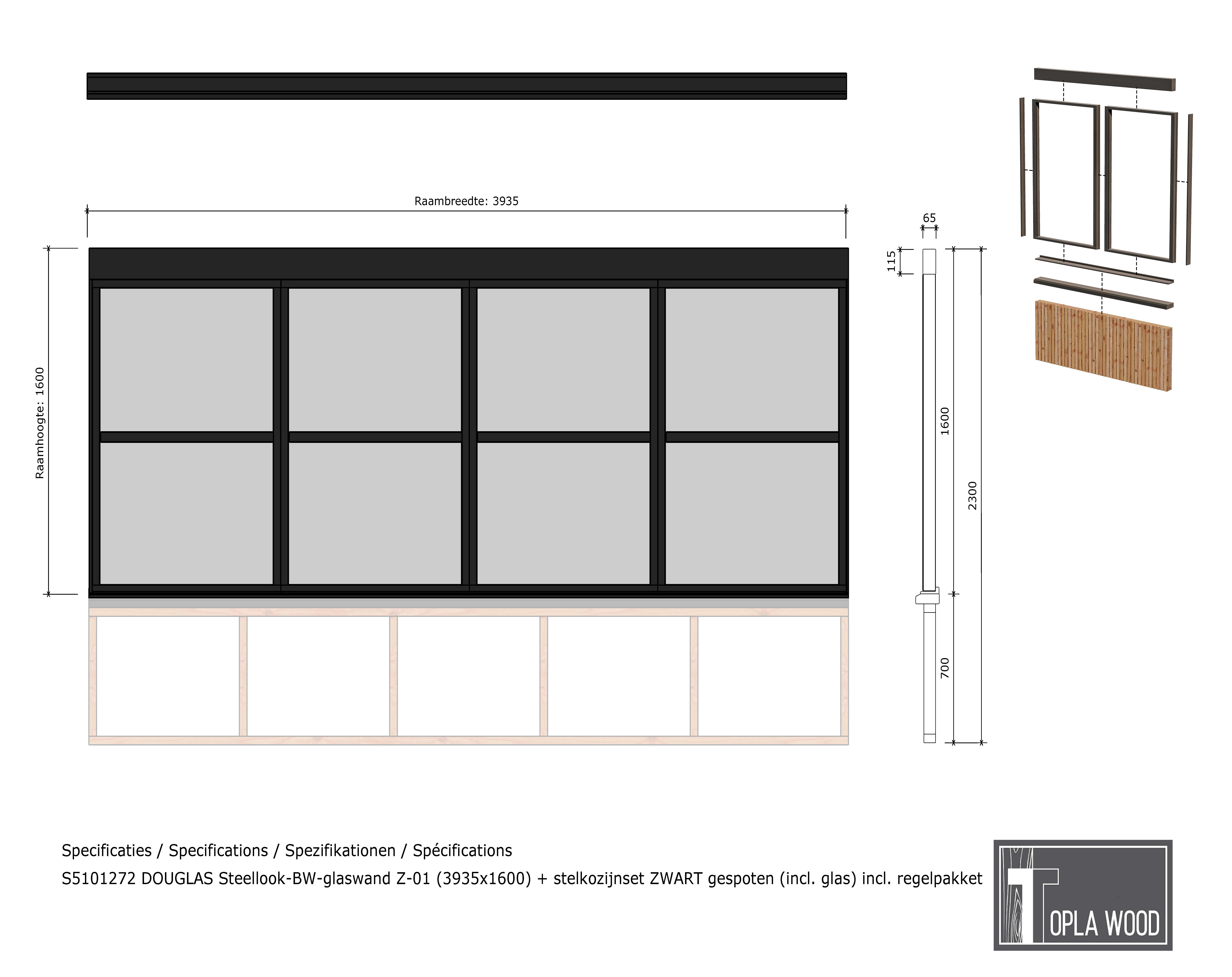 Douglas Steellook borstwering-glaswand Z-01 3935x1600 mm, zwart gespoten stelkozijnset, borstwering en isolatieglas (4-6-4) met 1 roede (vrije indeling). Duurzaam Douglas hout met strak steellook design, ideaal voor buitenverblijven, veranda’s en tuinkamers.
